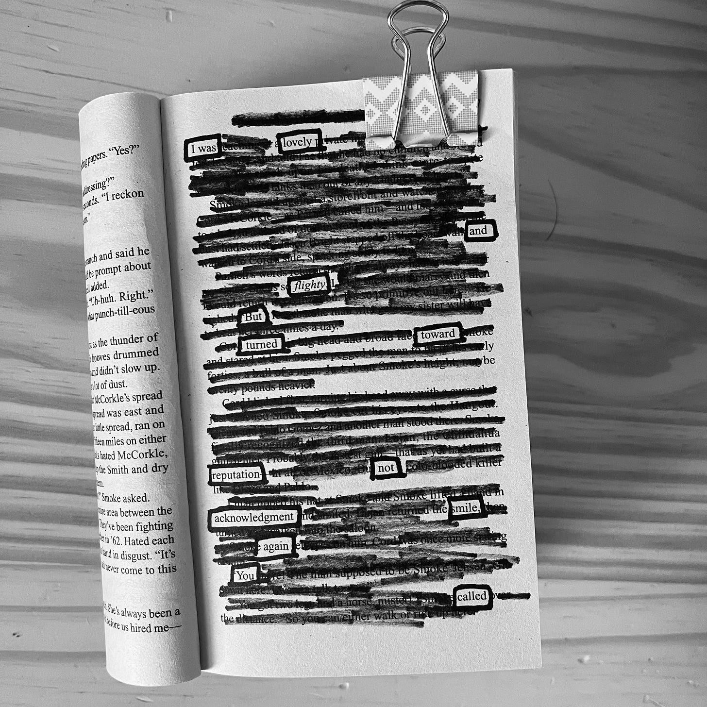 I’ve been trying to find ways to be on my phone less, but still wanted something tangible to do that helps my brain chill out. Enter in erasure poetry. It has been a great slow dopamine hit trying to piece together poems from literature. I went to the thrift store, found an old western novel for two bucks, and have had tons of fun making poems.